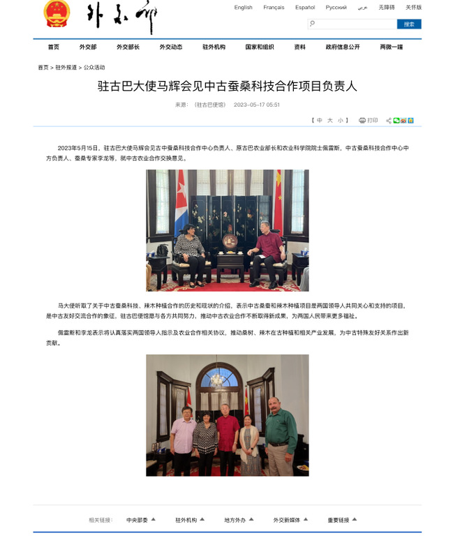 外交部《駐古巴大使馬輝會見中古蠶桑科技合作項目負責人》(2023年5月17日)