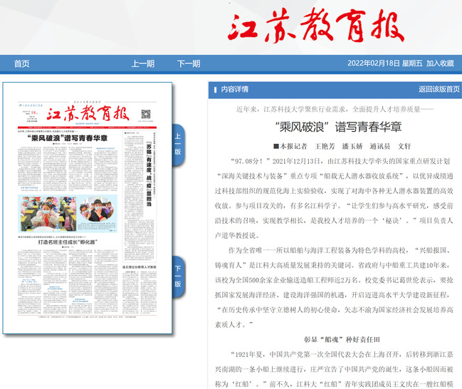 江蘇教育報《近年來,江蘇科技大學聚焦行業需求,全面提升人才培養質量