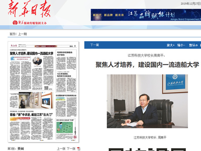新華日報《江蘇科技大學校長周南平:聚焦人才培養,建設國內一流造船大學》(2019年12月27日)