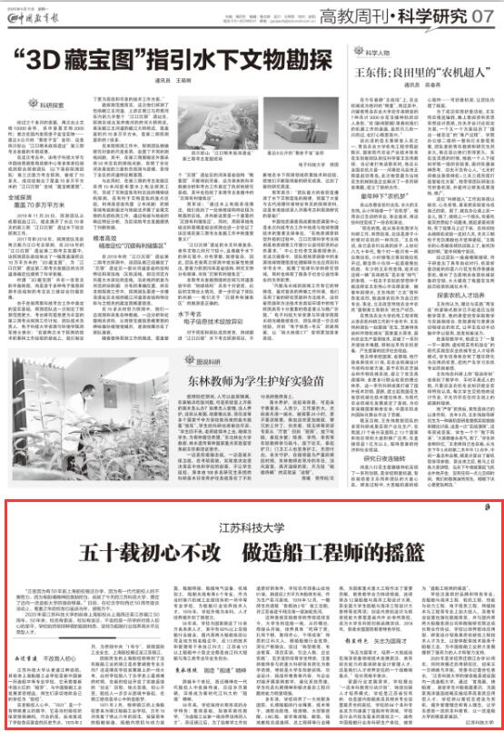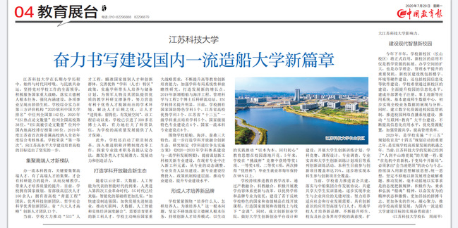 中國教育報《江蘇科技大學奮力書寫建設國內一流造船大學新篇章》(2020年7月20日)