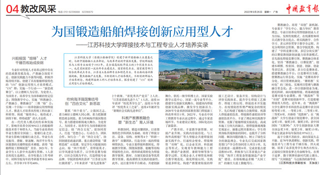 中國教育報《為國鍛造船舶焊接創新應用型人才——江蘇科技大學焊接技術與工程專業人才培養實錄》(2022年9月26日)