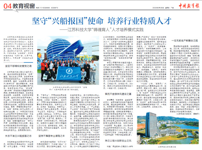 中國教育報《堅守“興船報國”使命 培養行業特質人才——江蘇科技大學“鑄魂育人”人才培養模式實踐》(2022年8月28日)