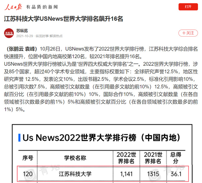 人民日報《江蘇科技大學USNews世界大學排名飆升16名》(2021年10月29日)
