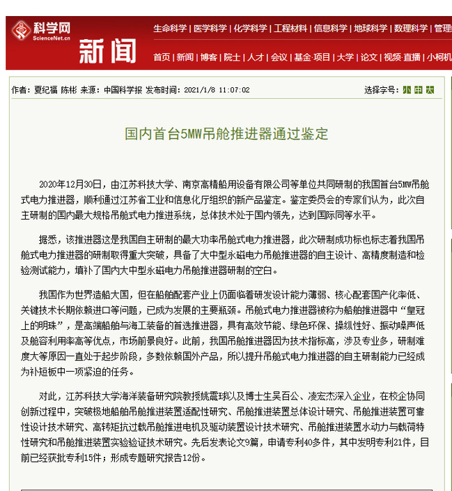 中國科學報《國內首臺5MW吊艙推進器通過鑒定》(2021年1月8日)