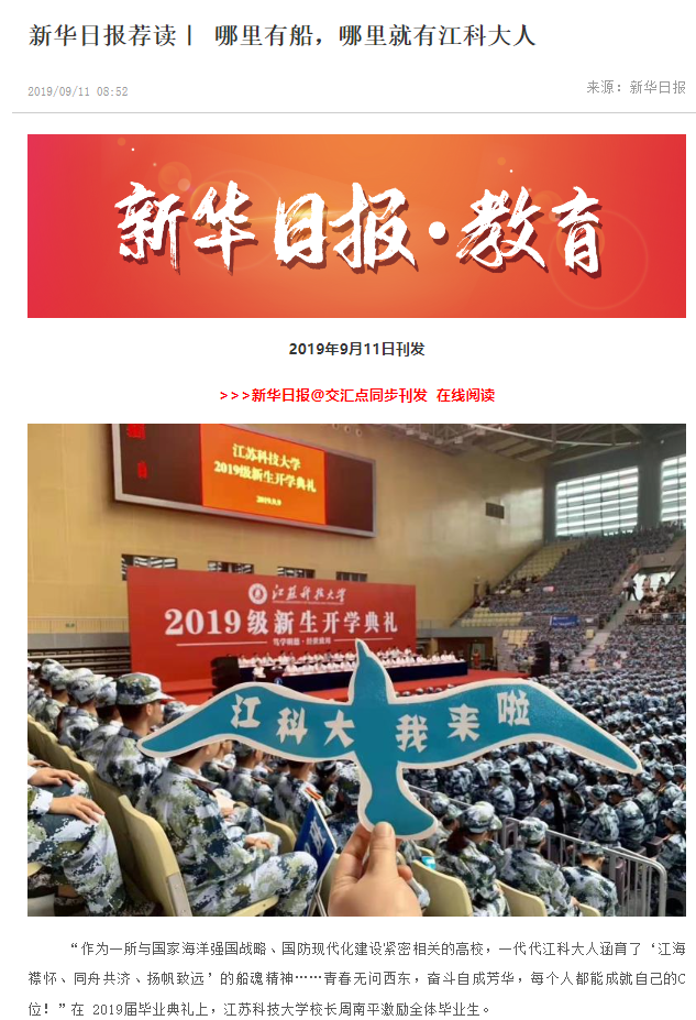 新華日報《哪里有船,哪里就有江科大人》(2019年9月11日)