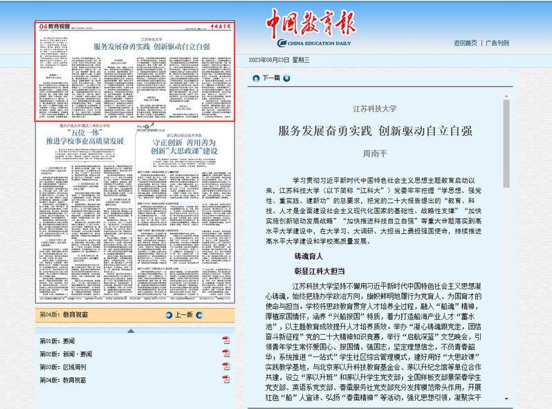 中國教育報《江蘇科技大學服務發展奮勇實踐 創新驅動自立自強》(2023年8月23日)