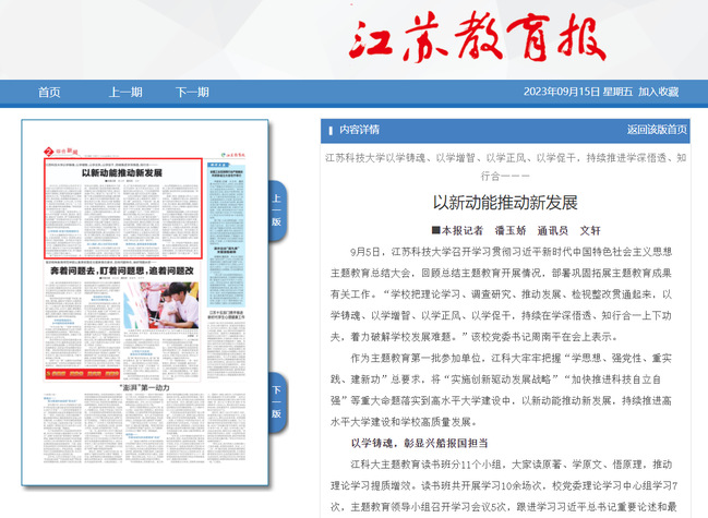 江蘇教育報《江蘇科技大學以學鑄魂、以學增智、以學正風、以學促干,持續推進學深悟透、知行合一——以新動能推動新發展》(2023年9月15日)