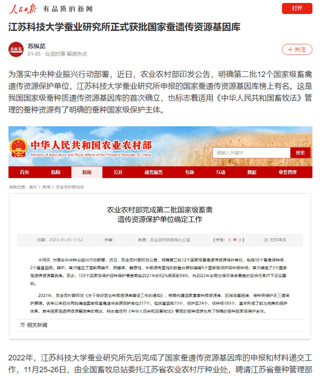 人民日報《江蘇科技大學蠶業研究所正式獲批國家蠶遺傳資源基因庫》(2023年1月5日)
