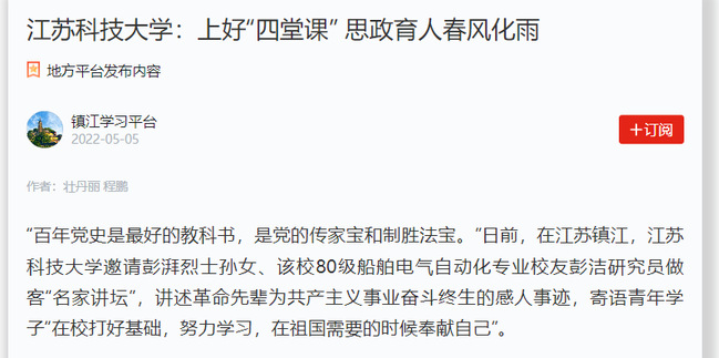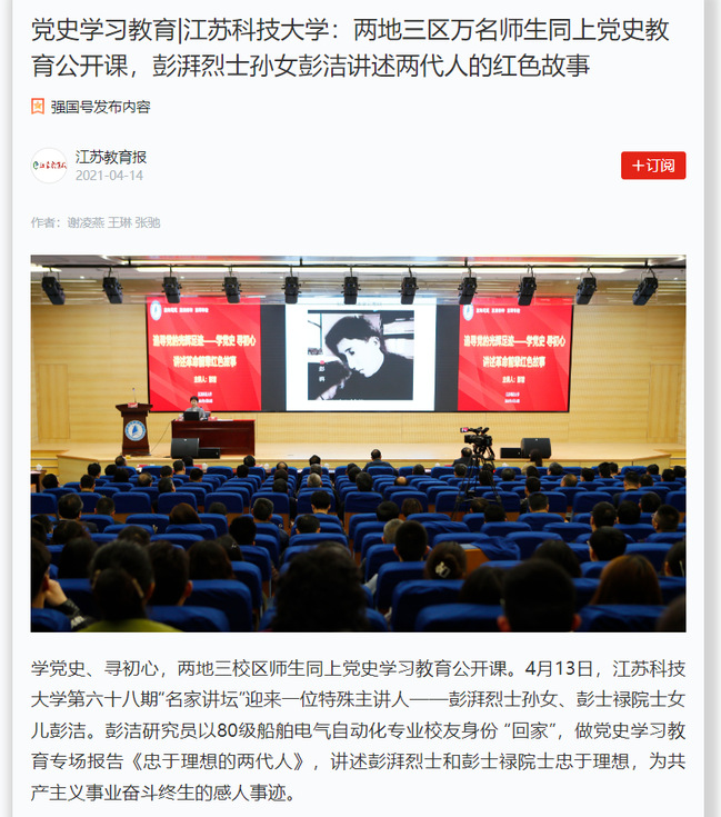 學習強國《黨史學習教育|江蘇科技大學:兩地三區萬名師生同上黨史學習教育公開課,彭湃烈士孫女彭潔講述兩代人的紅色故事》(2021年4月14日)