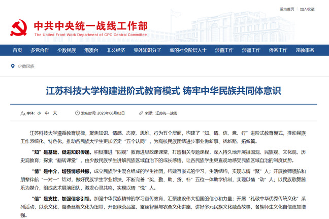 中共中央統一戰線工作部《江蘇科技大學構建進階式教育模式鑄牢中華民族共同體意識》