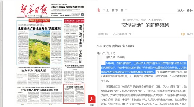新華日報《鎮江推動產業、創新、人才相互促進 “雙創福地”的新路超越》(2022年8月17日)