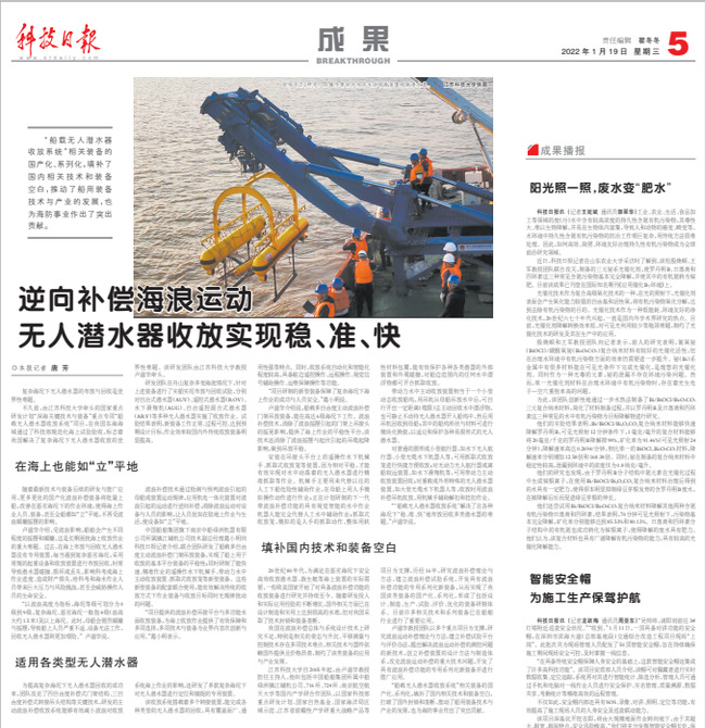 科技日報《逆向補償海浪運動 無人潛水器收放實現穩、準、快》(2022年1月19日)