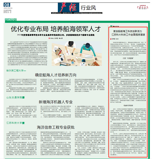 中國船舶報《激發船舶海工科技創新活力 江蘇科大科技工作全面提質增速》(2022年3月4日)