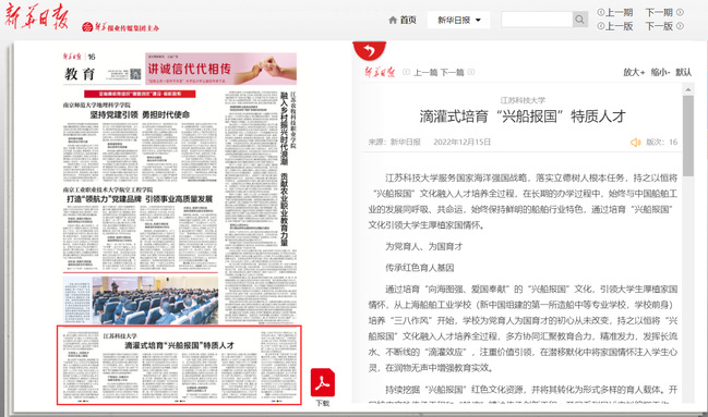 新華日報《江蘇科技大學滴灌式培育“興船報國”特質人才》(2022年12月15日)