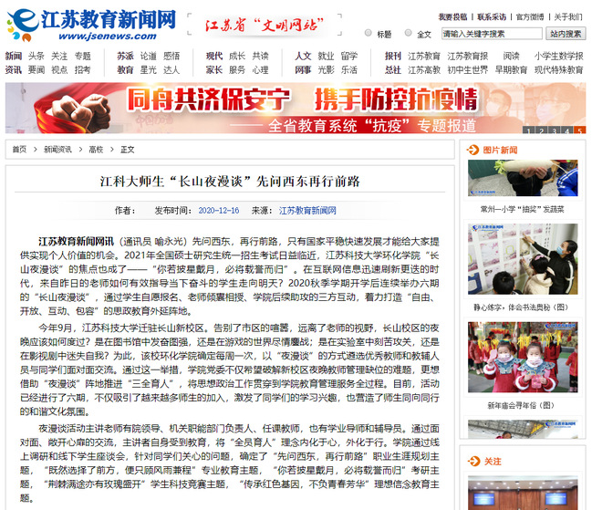 江蘇教育新聞網《江科大師生“長山夜漫談”先問西東再行前路》(2020年12月16日)