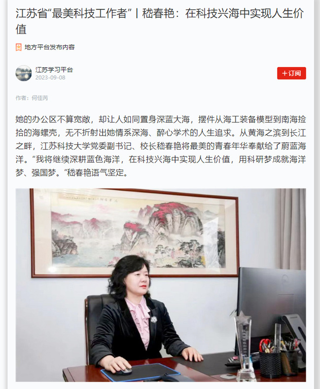 學習強國《江蘇省“最美科技工作者”丨嵇春艷:在科技興海中實現人生價值》(2023年9月8日)