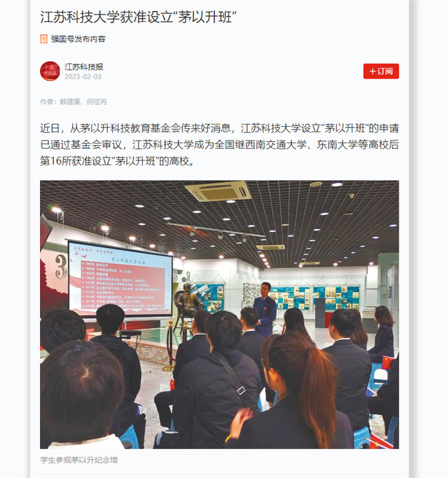 學習強國《江蘇科技大學獲準設立“茅以升班”》(2023年2月3日)