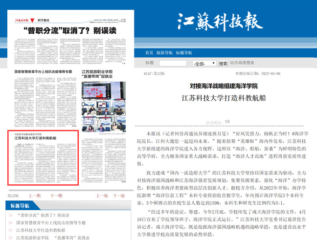 江蘇科技報《對接海洋戰略組建海洋學院 江蘇科技大學打造科教航船》(2022年5月6日)