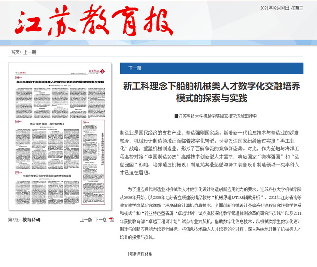 江蘇教育報《新工科理念下船舶機械類人才數字化交融培養模式的探索與實踐》(2021年2月3日)
