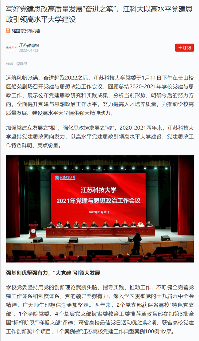 學習強國《寫好黨建思政高質量發展“奮進之筆”,江科大以高水平黨建思政引領高水平大學建設》(2022年1月13日)