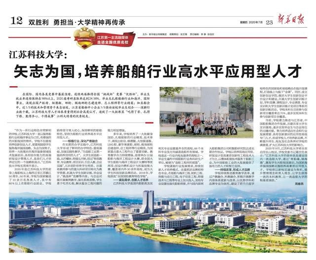 新華日報《江蘇科技大學:培養船舶行業高水平應用型人才》(2020年7月23日)