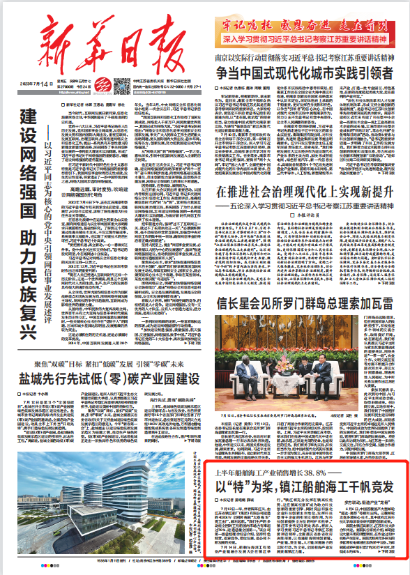 新華日報《以“特”為槳,鎮江船舶海工千帆競發》(2023年7月14日)