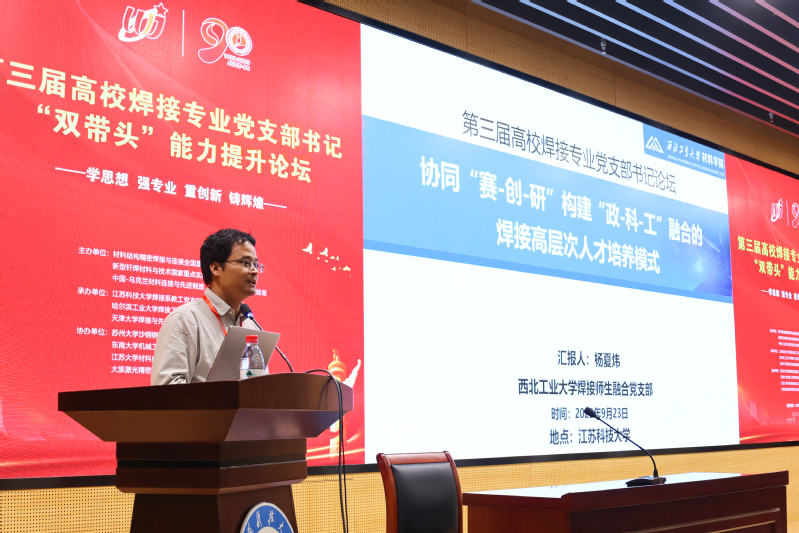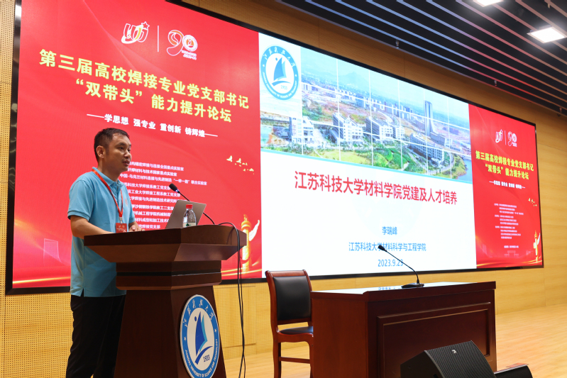 9月22日至24日,正值江蘇科技大學辦學90周年及焊接專業辦學70周年之際,第三屆高校焊接專業黨支部書記“雙帶頭”能力提升論壇在江蘇科技大學舉行,共有來自全國66家高校、1家企業的焊接專業(方向)黨支部書記、黨員骨干等近100人參會。江蘇科技大學黨委常委、副校長潘錦全,中國焊接學會副理事長、國際焊接學會技術委員會主席、北京工業大學教授李曉延,江蘇科技大學機關黨委書記、組織部副部長祁凱,哈爾濱工業大學材料學院黨委書記朱兆軍,美國焊接學會會士、山東大學武傳松教授,中船集團渤海造船有限公司副總工、江蘇科技大學焊接專業優秀校友劉殿寶,江蘇科技大學材料學院院長晏超等領導與專家參與了本屆論壇。