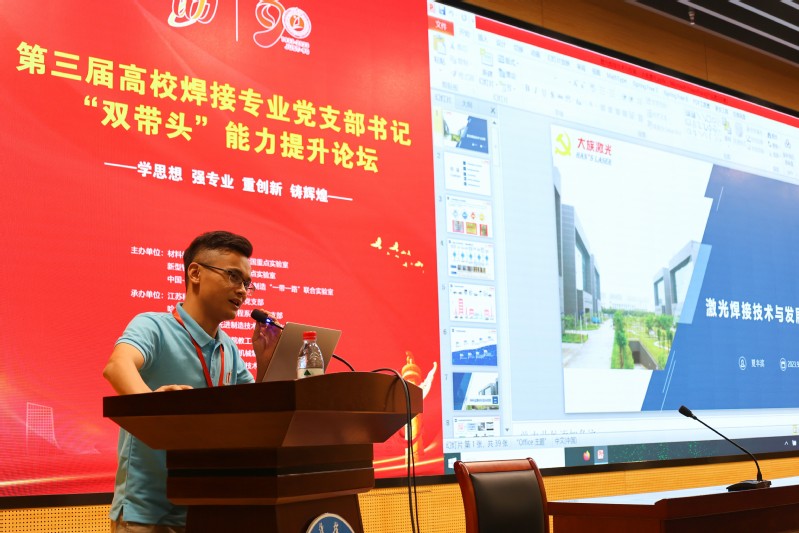下午,鎮江市委黨校馬克思主義理論教研室主任周秋琴教授以“堅持不懈用習近平新時代中國特色社會主義思想凝心鑄魂”為題,圍繞如何學習貫徹習近平新時代中國特色社會主義思想進行了系統深入的解讀。江蘇大學材料學院黨委書記楊娟以《學思踐悟黨的二十大,“一軸三翼”譜新篇》為題,就夯實基層黨建和焊接專業發展有機融合、互促提升,分享了江蘇大學在黨建方面取得的成效。江蘇科技大學材料學院黨委書記李瑞峰介紹了材料學院通過五個引領三創聯動,構建大黨建聯盟格局,打造亮點突出、特色鮮明的黨建品牌,推出“五型黨支部建設”,構建“頭雁效應”三全育人體系,黨員先鋒突破多項焊接關鍵技術,黨建引領專業發展的情況。西北工業大學焊接師生融合黨支部書記楊夏煒以《協同“賽-創-研”,構建“政-科-工”融合的焊接高層次人才培養模式》為題,針對焊接創新平臺的建設發展助力焊接人才培養進行了詳細介紹,旨在打造焊接人自己的創新平臺,為我國焊接專業和事業的發展及能力提升激發創新源泉。大族激光集團有限公司焊接研究院長夏豐濱介紹了激光焊接技術研究發展情況,鼓勵高校與企業聯合,推進“產學研”協同發展 。