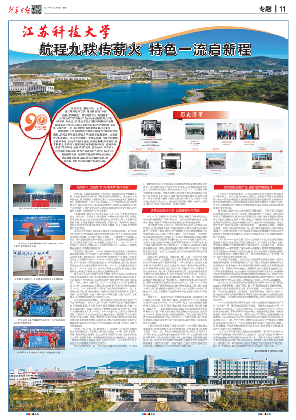 時序深秋,十里長山環繞中的江蘇科技大學湖光山色兩相和,這所高等學府正迎來辦學90周年發展盛事。九秩薪傳,華章溢彩。見證中國船舶工業奠基發展,與新中國船舶工業共命運,歷經多次校名變更、校址遷移和辦學轉型,江蘇科技大學始終與黨和國家的事業同向同行、同頻共振。秉承“篤學明德、經世致用”校訓,潛心辦學、樂育良才,為國家培養輸送20余萬名高素質的各類專門人才,為我國船舶工業、國防現代化建設和地方經濟社會發展作出積極貢獻,譜寫著腳踏實地、銳意進取、辦好人民滿意教育的動人詩篇。