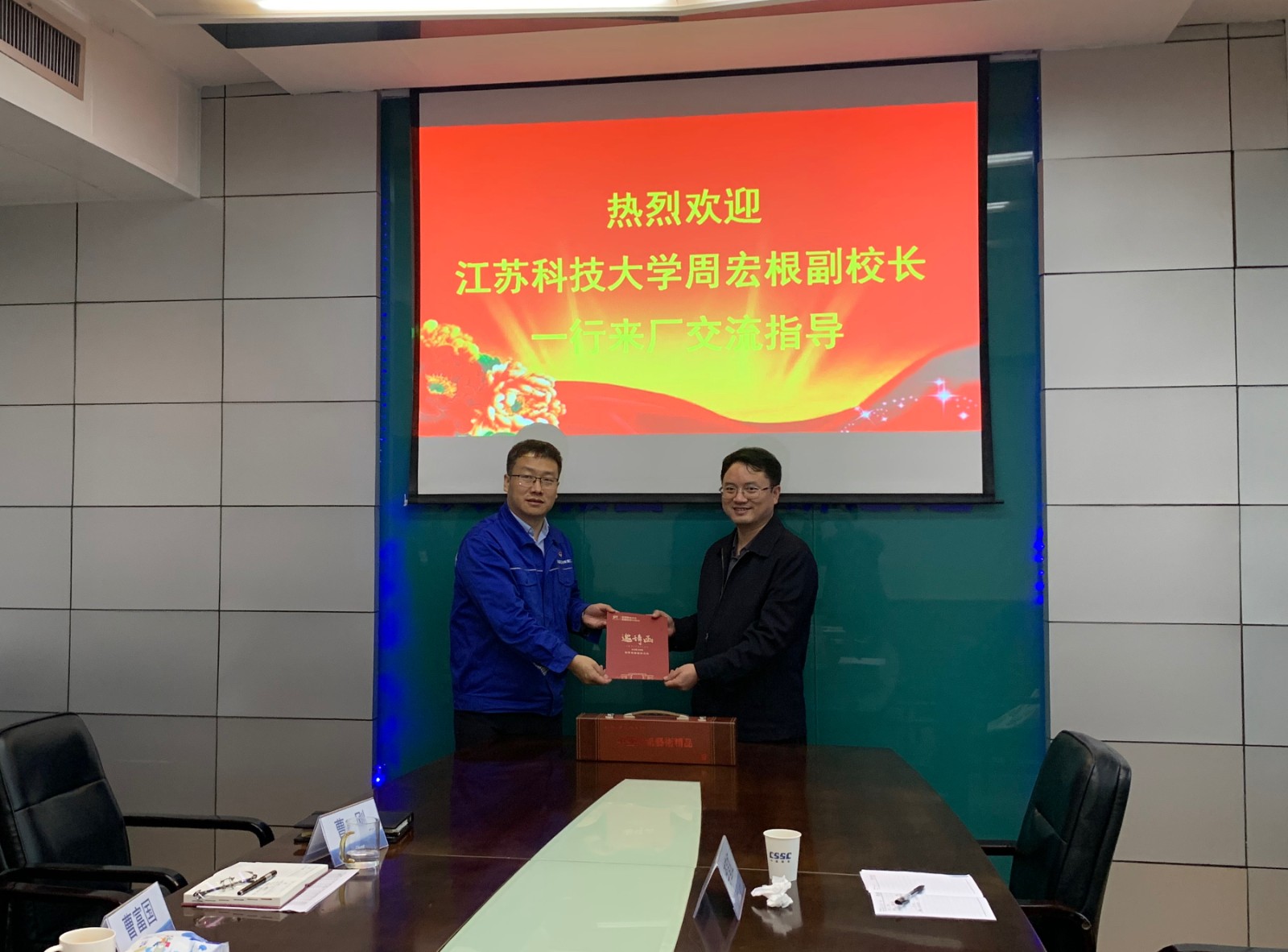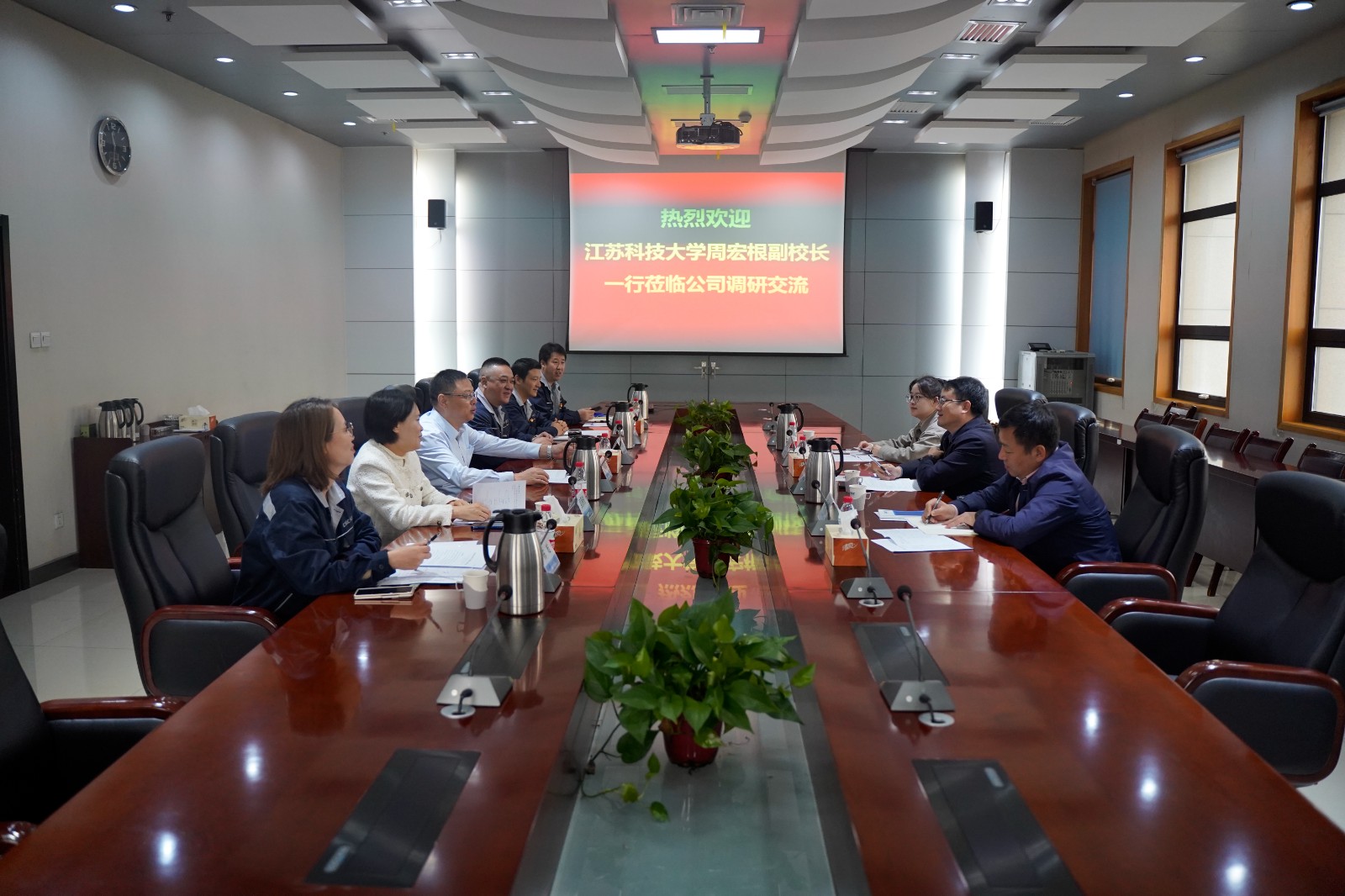校領(lǐng)導(dǎo)同時介紹了江蘇科技大學(xué)近五年來在學(xué)科、科研、教學(xué)、人才合作等方面取得的成績、及慶祝辦學(xué)90周年高質(zhì)量發(fā)展大會籌備情況,并強(qiáng)調(diào),在新時代新征程中,學(xué)校責(zé)無旁貸,要更好擔(dān)當(dāng)基礎(chǔ)研究主力軍使命,將大學(xué)的基礎(chǔ)研究與行業(yè)企業(yè)的科技創(chuàng)新緊密結(jié)合,校企攜手進(jìn)一步加強(qiáng)行業(yè)特色人才培養(yǎng)、重大工程協(xié)同創(chuàng)新、應(yīng)用技術(shù)開發(fā)和科研成果轉(zhuǎn)化等方面的合作,共同攻克創(chuàng)新難題,為行業(yè)實現(xiàn)高水平科技自立自強(qiáng)提供堅實支撐。