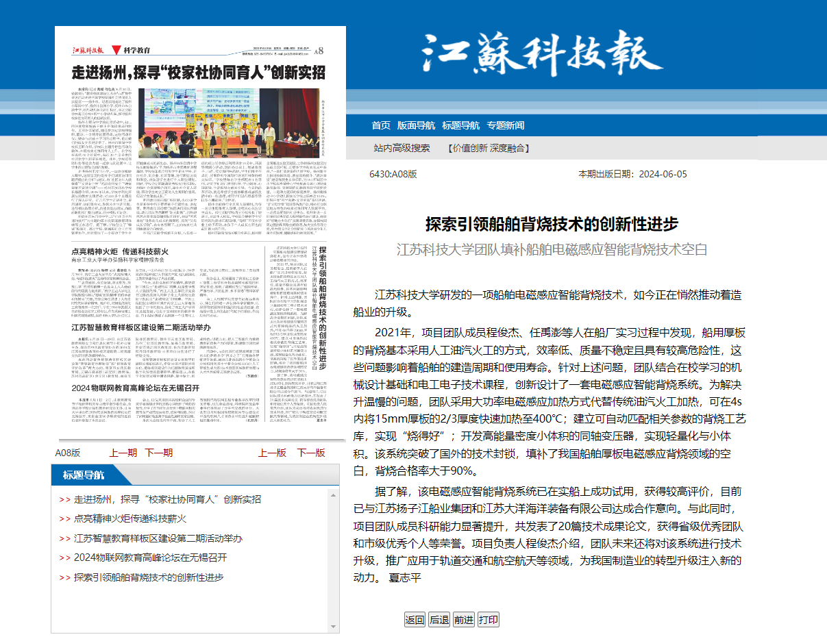 據了解,該電磁感應智能背燒系統已在實船上成功試用,獲得較高評價,目前已與江蘇揚子江船業集團和江蘇大洋海洋裝備有限公司達成合作意向。與此同時,項目團隊成員科研能力顯著提升,共發表了20篇技術成果論文,獲得省級優秀團隊和市級優秀個人等榮譽。項目負責人程俊杰介紹,團隊未來還將對該系統進行技術升級,推廣應用于軌道交通和航空航天等領域,為我國制造業的轉型升級注入新的動力。 夏志平