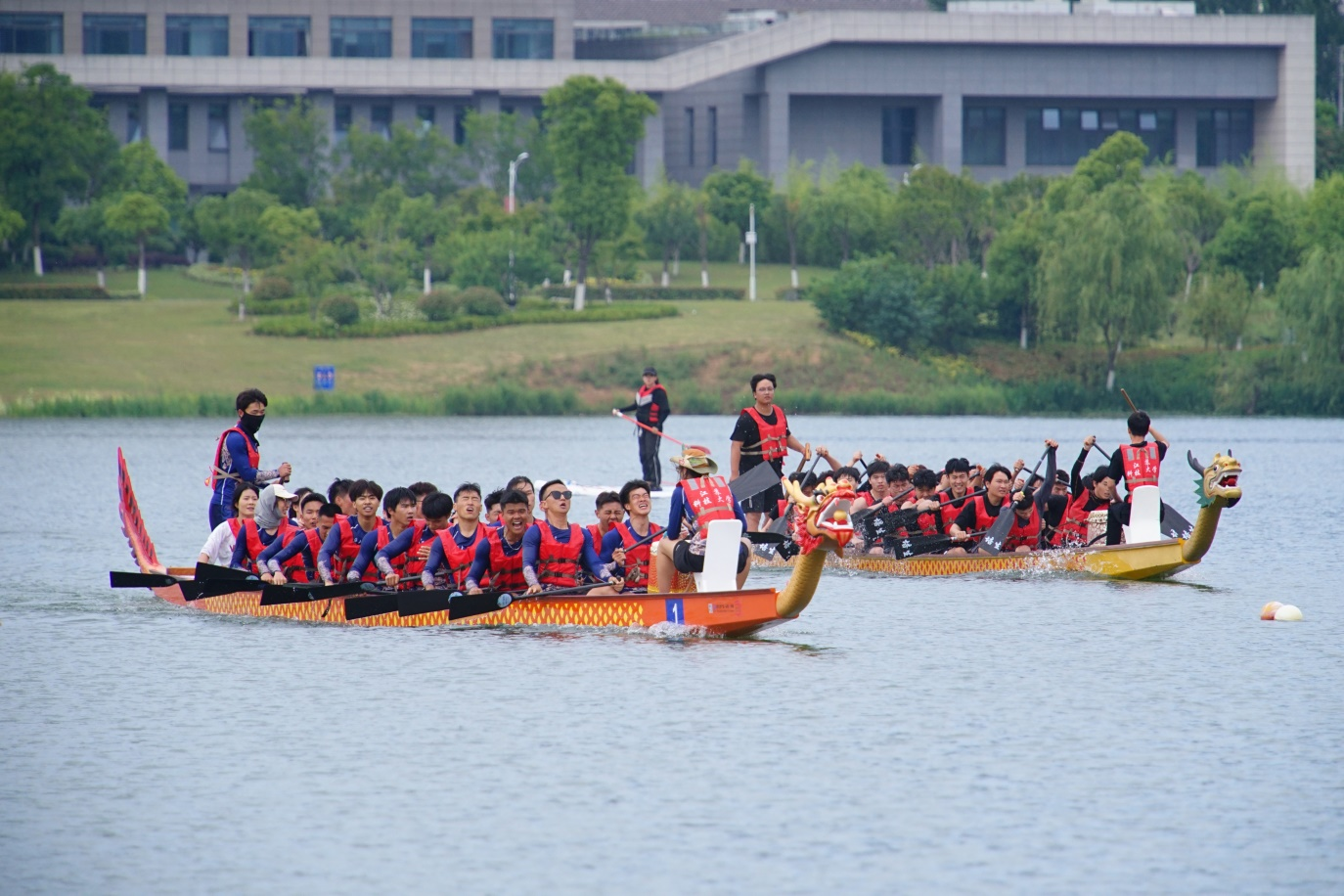 海韻湖上,飛槳逐浪,奮楫爭(zhēng)先,龍舟、皮劃艇疾馳而出。劃手們精神抖擻、動(dòng)作整齊劃一,伴著鏗鏘有力的鼓點(diǎn),提槳、彎腰、入水、劃動(dòng),一氣呵成,在師生的加油吶喊聲中,劈波逐浪、極速前行。本屆賽事共吸引15支參賽隊(duì)伍、312名參賽選手逐浪競(jìng)技。
