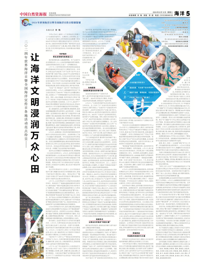 今年6月8日,是第十六個世界海洋日和第十七個全國海洋宣傳日。從南到北,由海至陸,這一天,海洋成為主題詞,自然資源部在福建廈門舉辦2024年世界海洋日暨全國海洋宣傳日主場活動。連日來,全國自然資源系統圍繞“保護海洋生態系統人與自然和諧共生”主題,精心策劃、積極開展內容豐富、形式多樣的宣傳活動,為加快建設海洋強國凝聚共識。