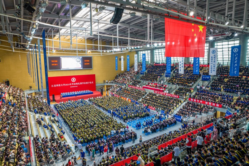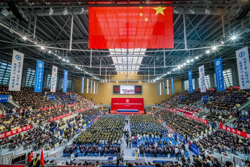 8點30分,在激昂雄壯的國歌聲中,畢業典禮盛大啟幕。主會場設鎮江大學城共享體育館,張家港校區設視頻分會場。學校在官方微信視頻號、B站、抖音、微博等平臺同步直播,師生校友“云端”相聚,共同見證青春榮光。