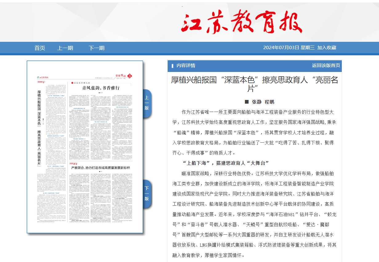 作為江蘇省唯一一所主要面向船舶與海洋工程裝備產業服務的行業特色型大學,江蘇科技大學始終高度重視思政育人工作,堅定服務國家海洋強國戰略,秉承“船魂”精神,厚植興船報國“深藍本色”,將其貫穿學校人才培養全過程,融入學校思政教育大格局,為船舶行業輸送了一大批“吃得了苦、扎得下根、聚得齊心、干得成事”的特質人才。
