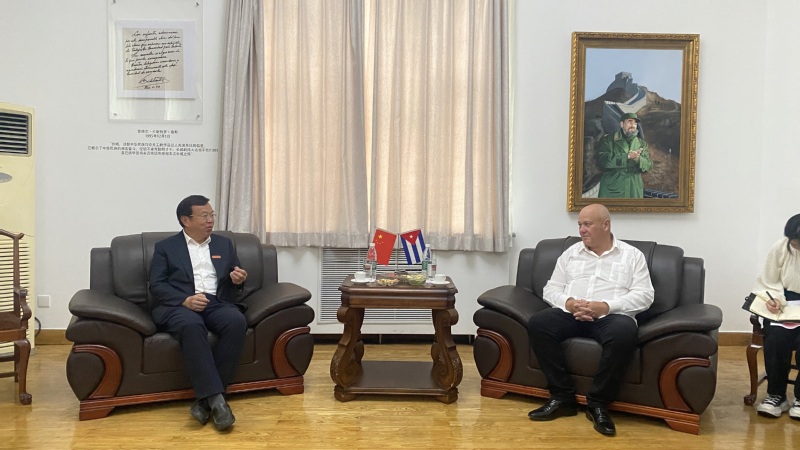 7月15日,來華出席全球共享發(fā)展行動(dòng)論壇第二屆高級(jí)別會(huì)議的古巴副總理塔皮亞在古巴駐華大使館會(huì)見學(xué)校黨委書記周南平。