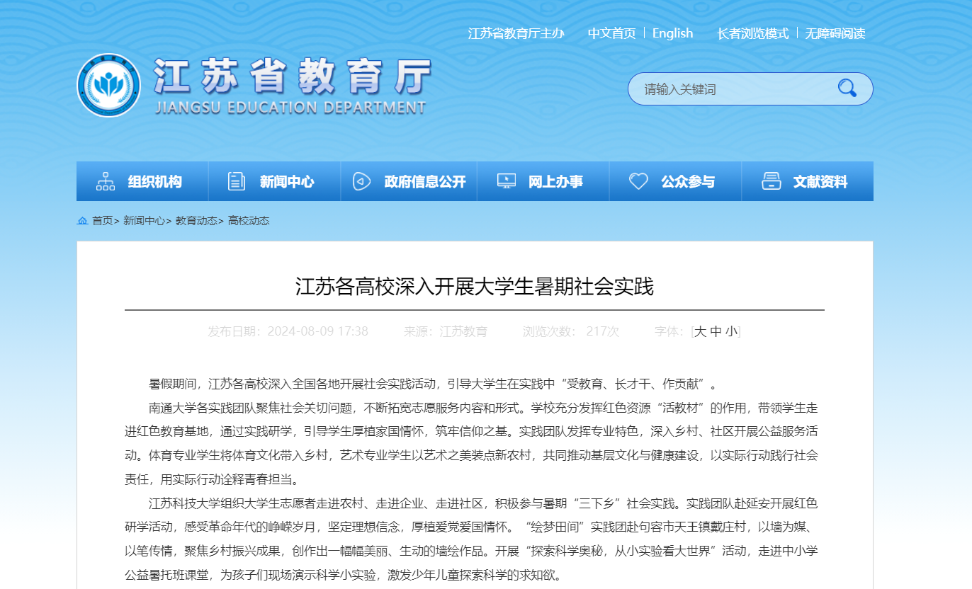 暑假期間,江蘇各高校深入全國各地開展社會實踐活動,引導大學生在實踐中“受教育、長才干、作貢獻”。