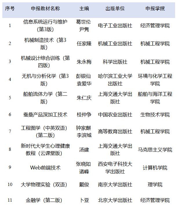 近日,江蘇省教育廳公布了“十四五”普通高等教育本科省級規(guī)劃教材及推薦國家級教材結(jié)果,我校共有11部教材入選省級規(guī)劃教材。其中,《信息系統(tǒng)運(yùn)行與維護(hù)(第3版)》《機(jī)械制造技術(shù)(第3版)》《機(jī)械設(shè)計綜合訓(xùn)練(第四版)》和《無機(jī)與分析化學(xué)(第3版》等4部教材被推薦申報教育部“十四五”普通高等教育本科國家級規(guī)劃教材。