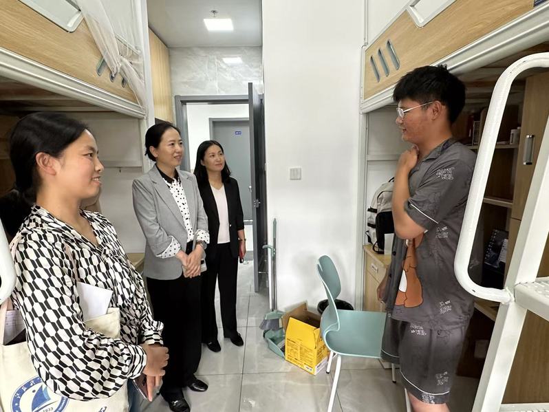 任南帶隊走進11號組團新生宿舍,認真查看新生宿舍的各項設(shè)施設(shè)備,詳細詢問了新生們來自何處、初入校園的感受及對新環(huán)境的適應(yīng)程度,從住宿飲食、生活習(xí)慣、發(fā)展規(guī)劃等多方面了解新生情況。對于新生入住所遇到的各個問題,進行了及時的答疑溝通,幫助同學(xué)們盡快適應(yīng)新生活。“住的怎么樣""還習(xí)慣嗎”,對于一些來自外地的同學(xué),任南副校長關(guān)切地詢問他們是否有什么不適應(yīng)的地方,并囑咐同宿舍的同學(xué)們生活上互相幫助、團結(jié)友愛,在學(xué)習(xí)上也要共同進步,互相幫扶。任南副校長提醒學(xué)生們宿舍要保持通風(fēng),做好個人及宿舍衛(wèi)生;遇到困難及時和學(xué)院領(lǐng)導(dǎo)、輔導(dǎo)員聯(lián)系;在校期間,要服從學(xué)校教育管理,認真做好學(xué)業(yè)生涯規(guī)劃。