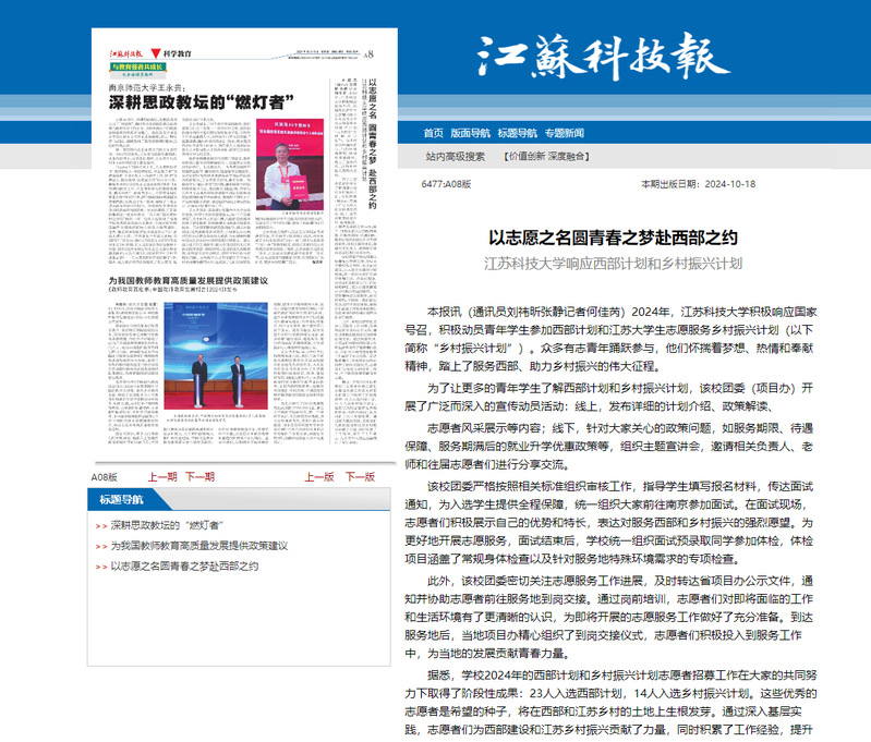 本報訊(通訊員劉祎昕張靜記者何佳芮)2024年,江蘇科技大學積極響應國家號召,積極動員青年學生參加西部計劃和江蘇大學生志愿服務鄉村振興計劃(以下簡稱“鄉村振興計劃”)。眾多有志青年踴躍參與,他們懷揣著夢想、熱情和奉獻精神,踏上了服務西部、助力鄉村振興的偉大征程。