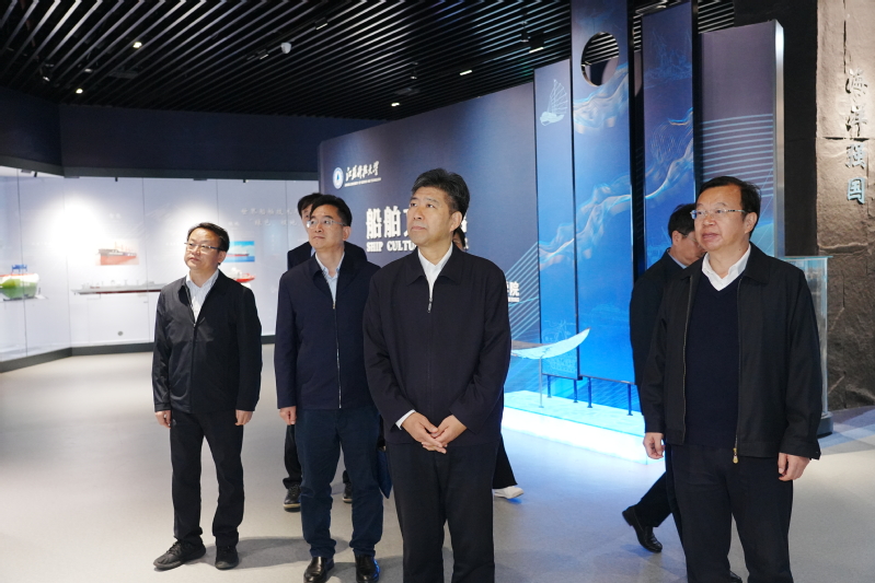 隨后,校黨委書記周南平,黨委常委、副校長潘錦全,黨委常委、紀委書記、監察專員安祥衛陪同曲福田一行參觀了學校船舶文化館。曲福田一行了解了我國的古船、民船、海洋工程船舶、軍船以及船舶海工大國重器的發展歷程,特別是由學校參與設計建造的代表船型情況,聽取了世界船舶技術產業未來發展方向的介紹。