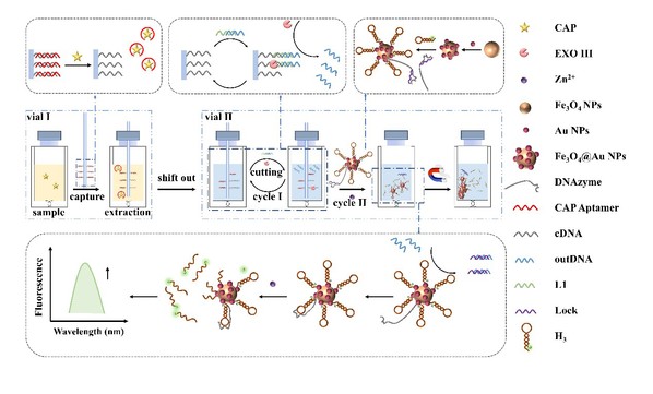 在此研究策略中,以表面修飾核酸序列的石英棒構建固相微萃取體系將分析物的識別捕獲、濃縮富集和檢測引入過程集合為一體,極大簡化了樣品前處理操作;通過石英棒基質與DNA酶循環剪切體系間的相互作用,將對氯霉素的檢測轉化為對特定核酸序列的檢測,并進行第一次核酸序列的擴增;通過在第四代傳感器—DNA步行機納米粒子表面進行核酸恒溫擴增的操作,對檢測信號進行了第二次擴增。