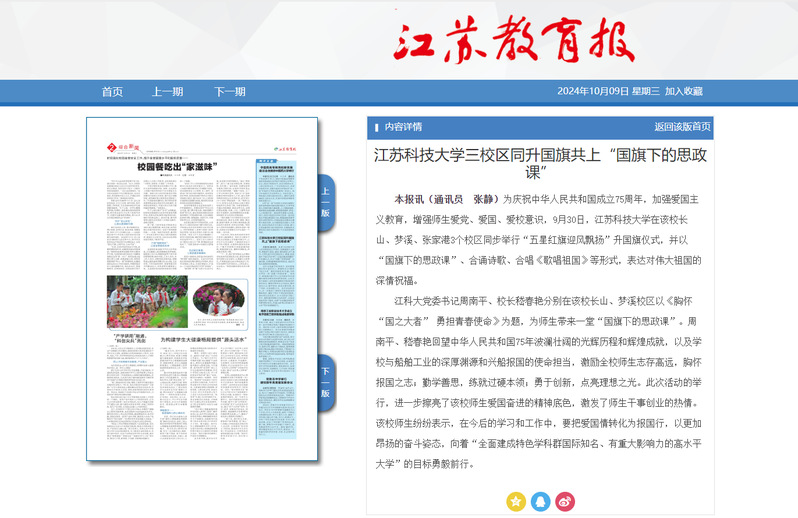 《江蘇教育報》報道學(xué)校三校區(qū)同升國旗共上“國旗下的思政課”