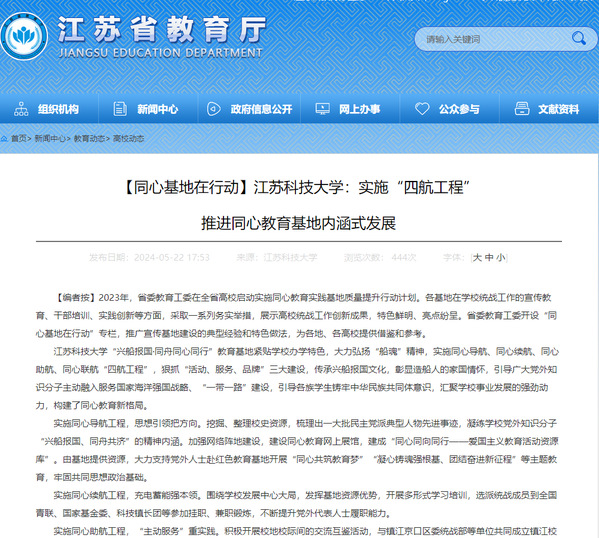 江蘇省教育廳官網(wǎng)報道學(xué)校推進同心教育基地內(nèi)涵式發(fā)展