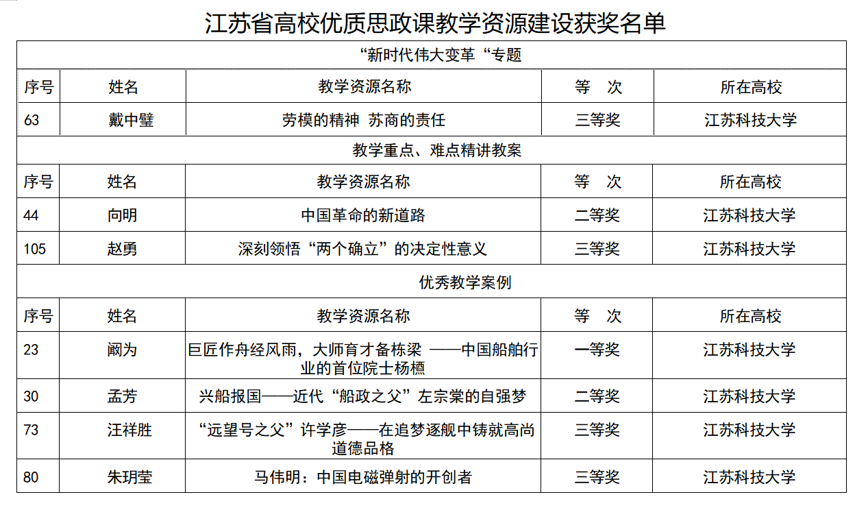 學(xué)校構(gòu)建“大思政”育人格局,思想政治教育明理明道、入腦入心。印發(fā)《江蘇科技大學(xué)關(guān)于進一步完善思想政治工作體系落實時代新人鑄魂工程的實施方案》,健全黨委統(tǒng)一領(lǐng)導(dǎo)的思政工作機制。成立課程思政工作領(lǐng)導(dǎo)小組、課程思政教學(xué)研究中心,明確黨政主要領(lǐng)導(dǎo)為課程思政建設(shè)第一責(zé)任人。選優(yōu)育強思想鑄魂育人中堅力量,校領(lǐng)導(dǎo)班子成員深入課堂一線講授專題思政課。深入挖掘各學(xué)科專業(yè)課程及各教學(xué)環(huán)節(jié)蘊含的思政育人資源,定期組織思政育人專項研討會、經(jīng)驗交流會,思政隊伍建設(shè)有力提升。“黨的二十屆三中全會精神融入研究生思政課”學(xué)術(shù)研討會在學(xué)校召開,人民網(wǎng)專題報道學(xué)校以“大思政”推動思政課建設(shè)內(nèi)涵式發(fā)展,1名教師獲全國高校思政課教學(xué)展示特等獎。