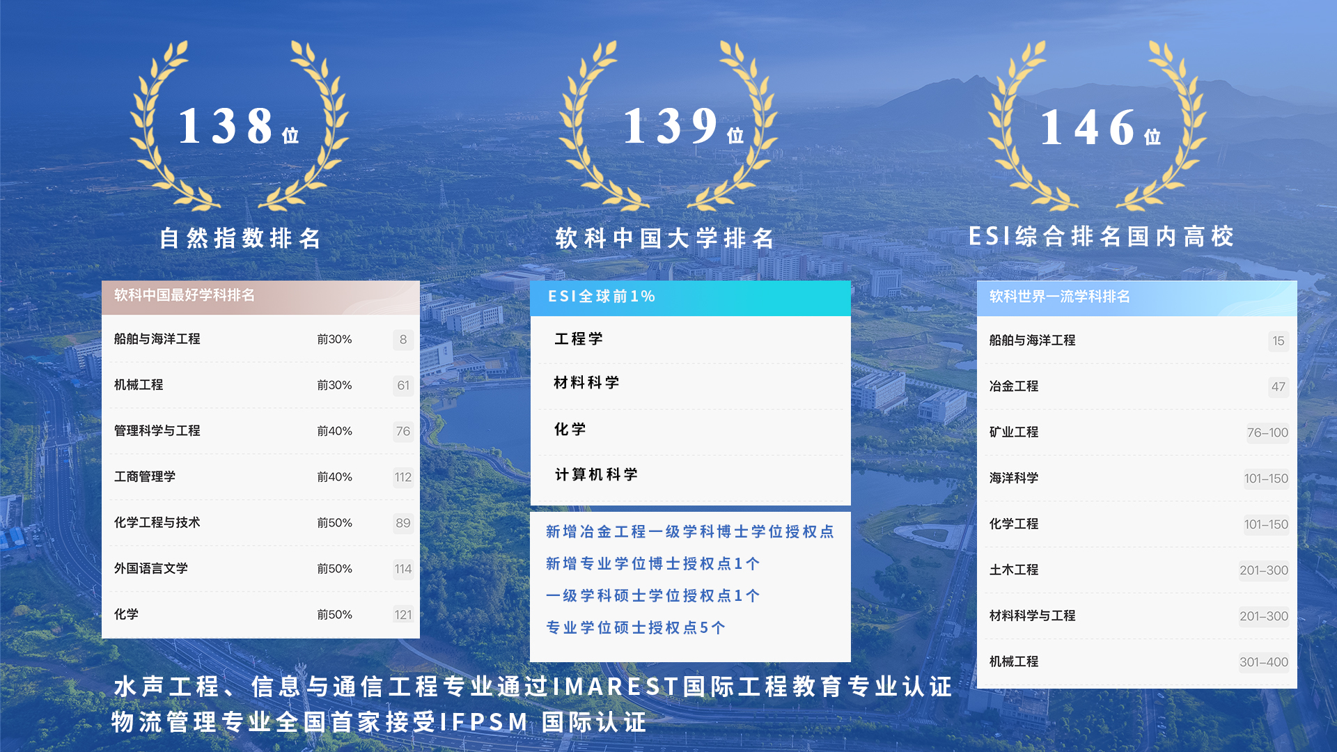 第三方評價機構軟科中國大學排名139位,ESI綜合排名國內高校第146位,自然指數排名138位,5個學科進入ESI全球前1%。新增冶金工程一級學科博士學位授權點,填補江蘇高校該學科博士點空白;新增專業學位博士授權點1個,實現專業學位博士點零的突破,一級學科碩士學位授權點1個,專業學位碩士授權點5個。水聲工程、信息與通信工程專業通過IMarEST國際工程教育專業認證。物流管理專業全國首家接受IFPSM 國際認證。獲批江蘇省卓越工程師學院。