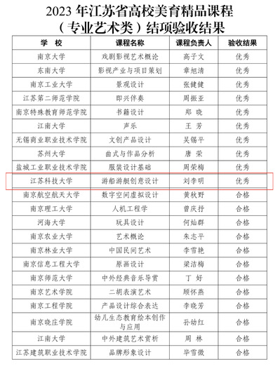 近日,省教育廳對 2023 年省高校美育精品課程(專業藝術類)建設進行了結題驗收,我校機械工程學院劉李明副教授負責的《游船游艇創意設計》課程結題驗收獲“優秀”等次,全省共30項通過結題驗收,其中優秀項目10項。