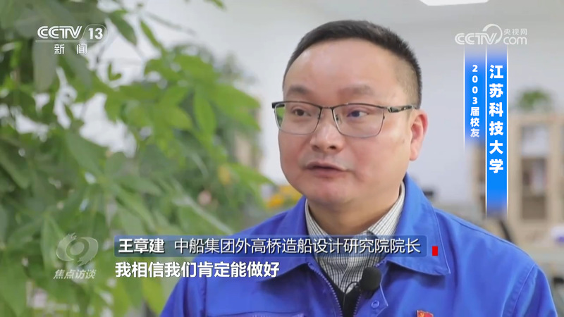 “哪里有船,哪里就有江科大人!”2月19日,央視《焦點訪談》推出系列節(jié)目《干字當(dāng)頭開好局》,首站聚焦造船業(yè)。節(jié)目中,我校船舶與海洋工程學(xué)院2003屆校友、中船集團外高橋造船設(shè)計研究院院長王章建受邀參與訪談。