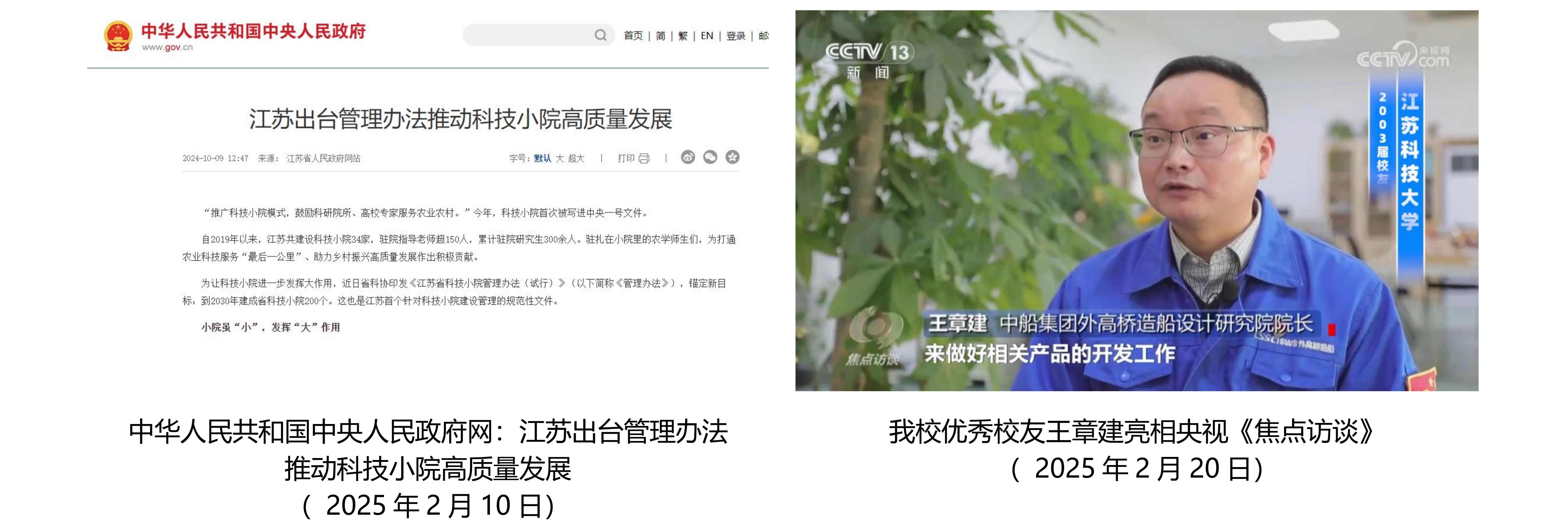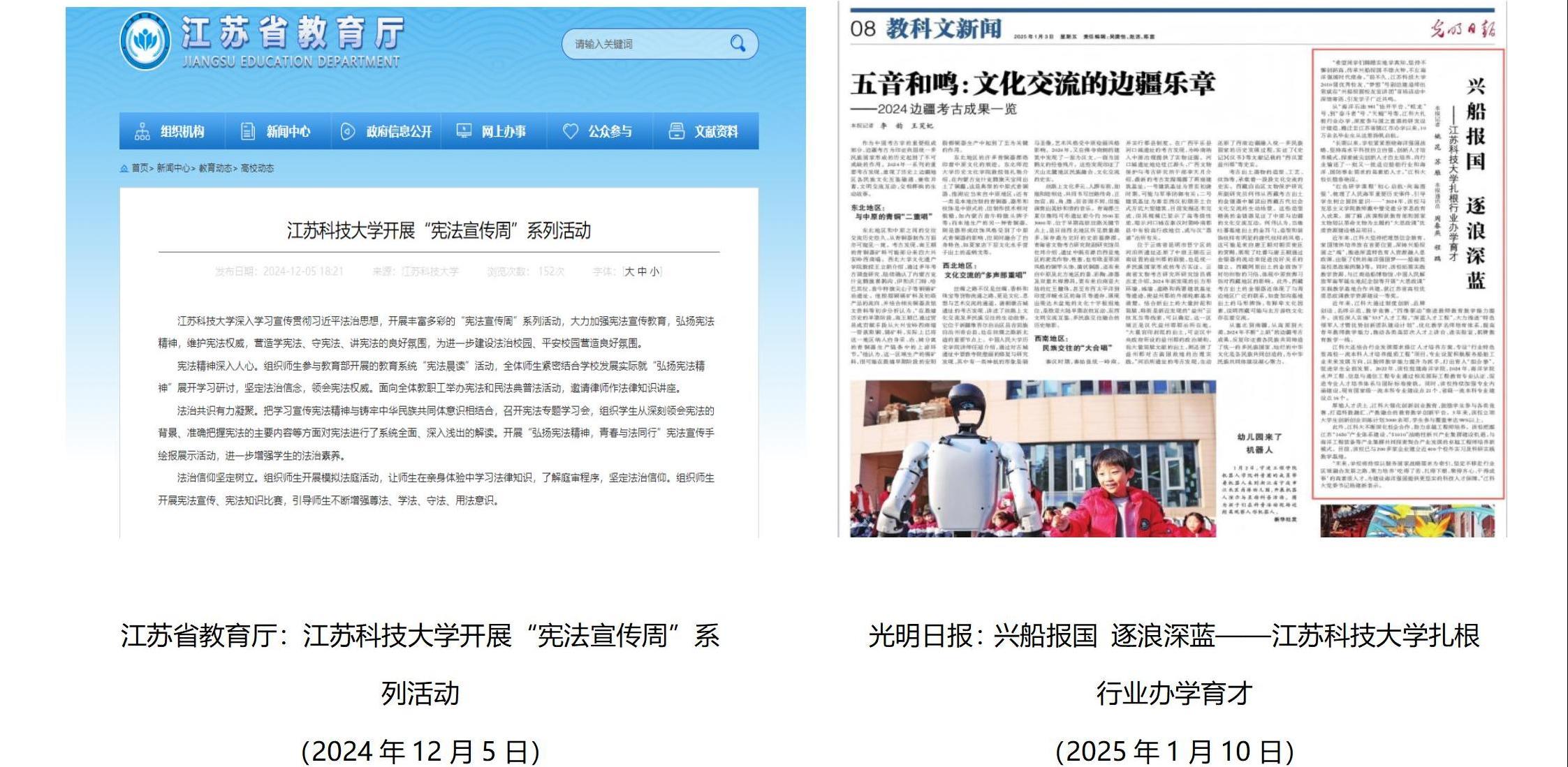 中央電視臺、央視新聞多次報道學校深化產教融合,服務船舶海工產業科技創新;中國船舶報、新華日報、江蘇科技報等媒體深度報道學校辦學90周年,校史館揭幕開館;人民日報、新華社、科技日報等深度報道學校首次以第一單位在《Nature》發表研究論文,新華日報跟進報道該成果落地轉化動向;新華日報深度報道學??萍贾a首艘大型郵輪建造;中國船舶報、新華日報、江蘇省教育廳官網等報道學校牽頭江蘇省高技術船舶和海工裝備產業鏈黨組織聯建共建;中國新聞網報道學校趣味蠶桑課程受學生熱捧;與央視網共創《我的大學超酷》播放量超百萬……