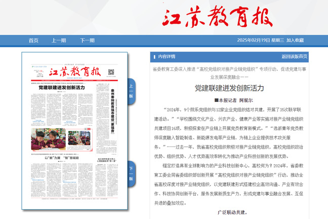 高校黨組織和產業鏈黨組織有效對接,讓雙方聚焦國家和江蘇現代化產業體系和戰略性新興產業集群,集智聚力解決鏈上企業技術難題,這是我省打通科研成果從實驗室到生產線轉移轉化關鍵堵點的創新嘗試。“黨建聯建讓高校對區域、產業需求更加了解,更能有效強化科技創新成果和創新創業人才的高質量供給。”省委教育工委副書記潘漫表示。